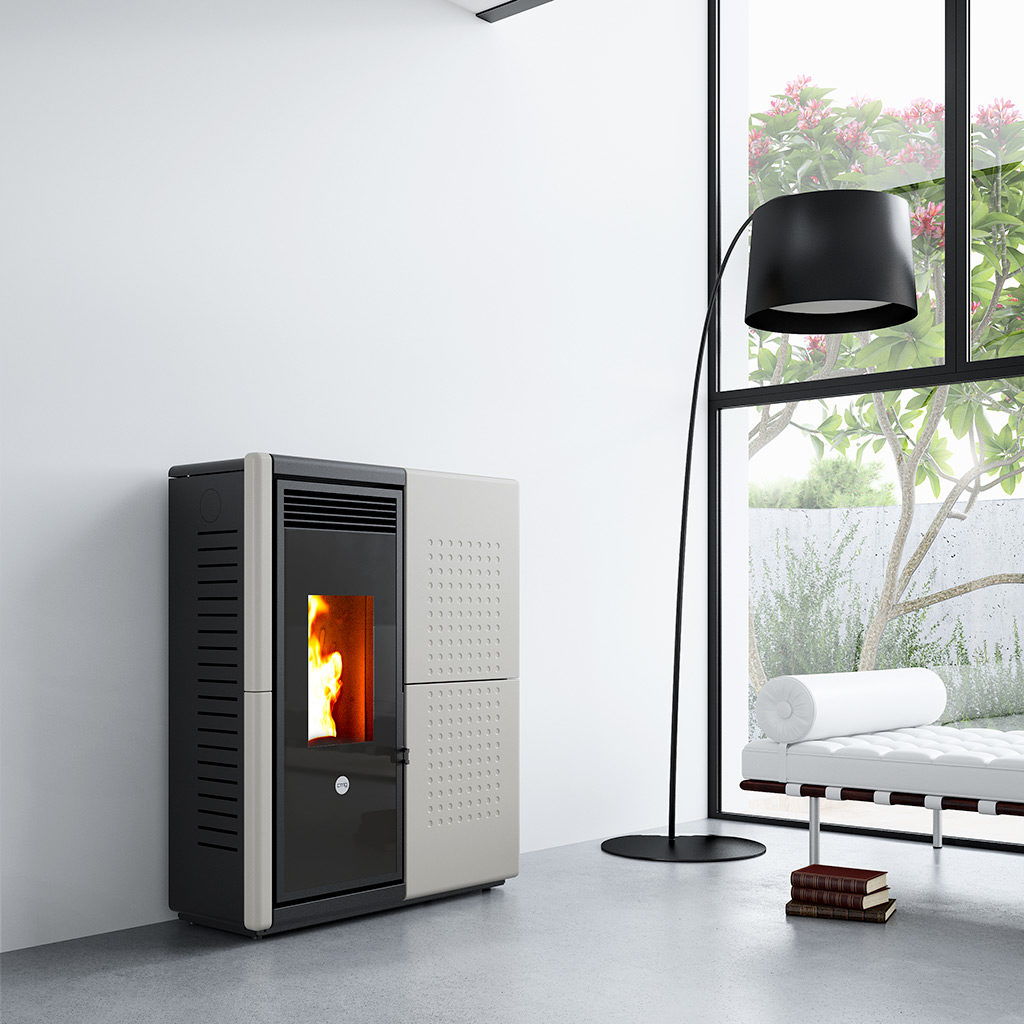 AXE est un poêle à granulés étanche extra plat. Profitez de tous les avantages de la technologie granulés avec ce concentré d’efficacité de faible encombrement. La ventilation canalisable permet de répartir harmonieusement la chaleur dans la pièce de vie ou de chauffer une pièce adjacente. Le poêle est présenté avec son habillage en céramique aux motifs décoratifs offrant une vision très contemporaine du chauffage au bois.