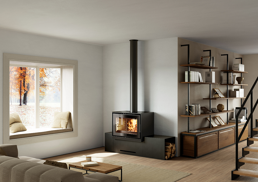 - Sur son piédestal en acier peint, le poêle à bois MAORI offre un écrin aérien à…