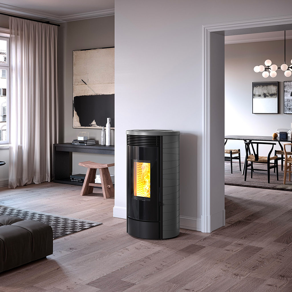 Le poêle à granulés NVI est doté de la technologie Smart ventilation pour un fonctionnement silencieux et un maintien en température tout en douceur. Le poêle est présenté avec un élégant habillage céramique en ton mat. Les liserés soulignent harmonieusement sa silhouette ronde.