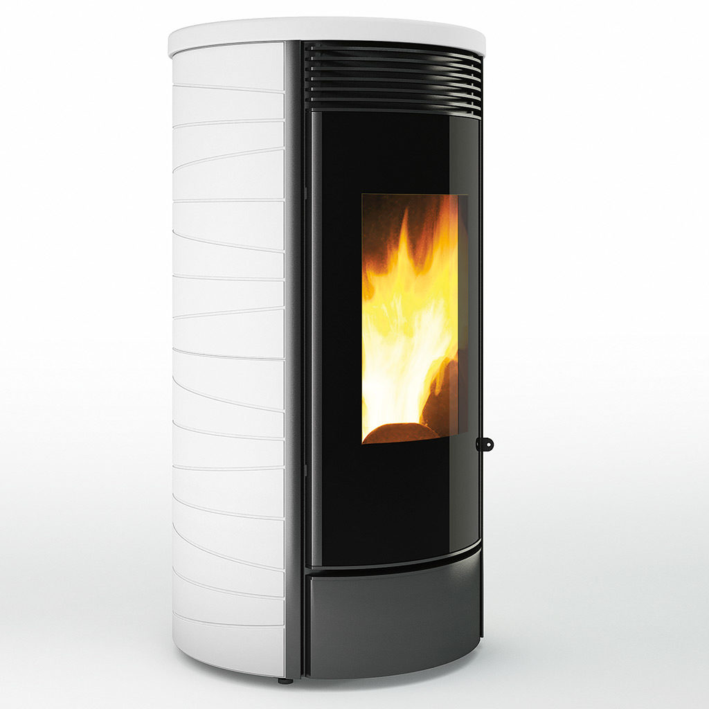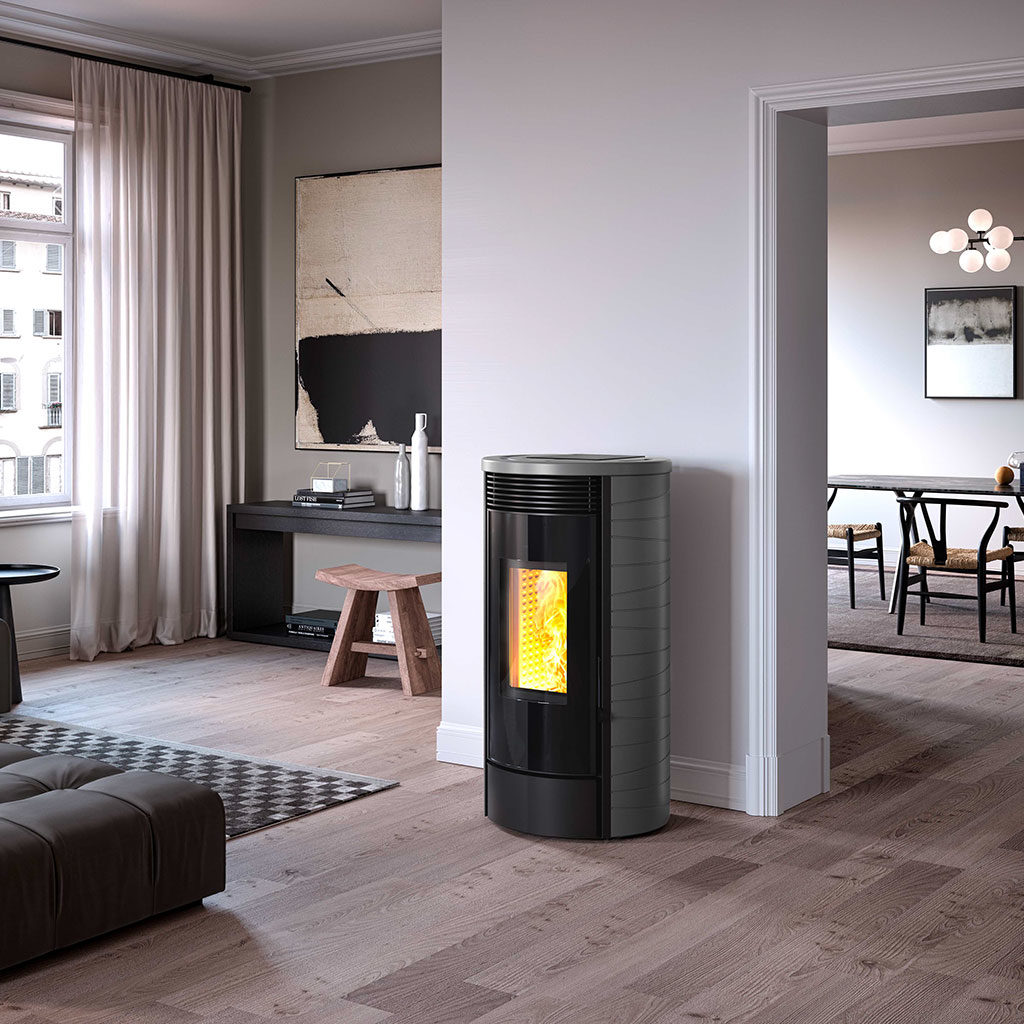 Le poêle à granulés NVI est doté de la technologie Smart ventilation pour un fonctionnement silencieux et un maintien en température tout en douceur. Le poêle est présenté avec un élégant habillage céramique en ton mat. Les liserés soulignent harmonieusement sa silhouette ronde.